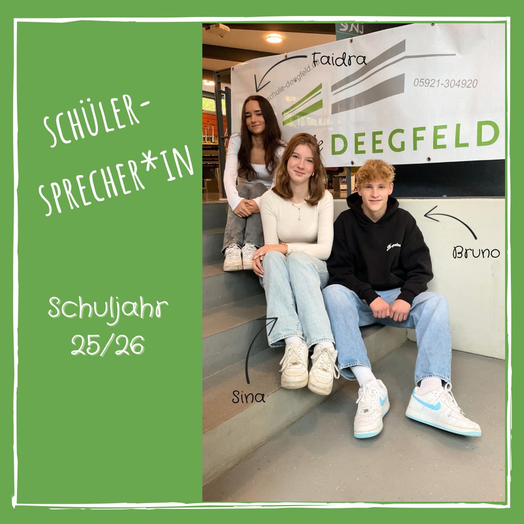 Schülersprecher Schuljahr 25/26 Wir möchten euch unsere neuen Schülersprecher*innen vorstellen! ✨ Die Klassensprecher*innen haben für euch gewählt: 1. Schülersprecher: Bruno Meinen (Klasse 10c) 2. Schülersprecherin: Sina Krabbe (Klasse 10e) Schulvorstand: Faidra Sideri (Klasse 10d) Die drei freuen sich auf ein spannendes Schuljahr voller Ideen und gemeinsamer Aktionen. Sie möchten das Schulleben aktiv mitgestalten und sich für die […]